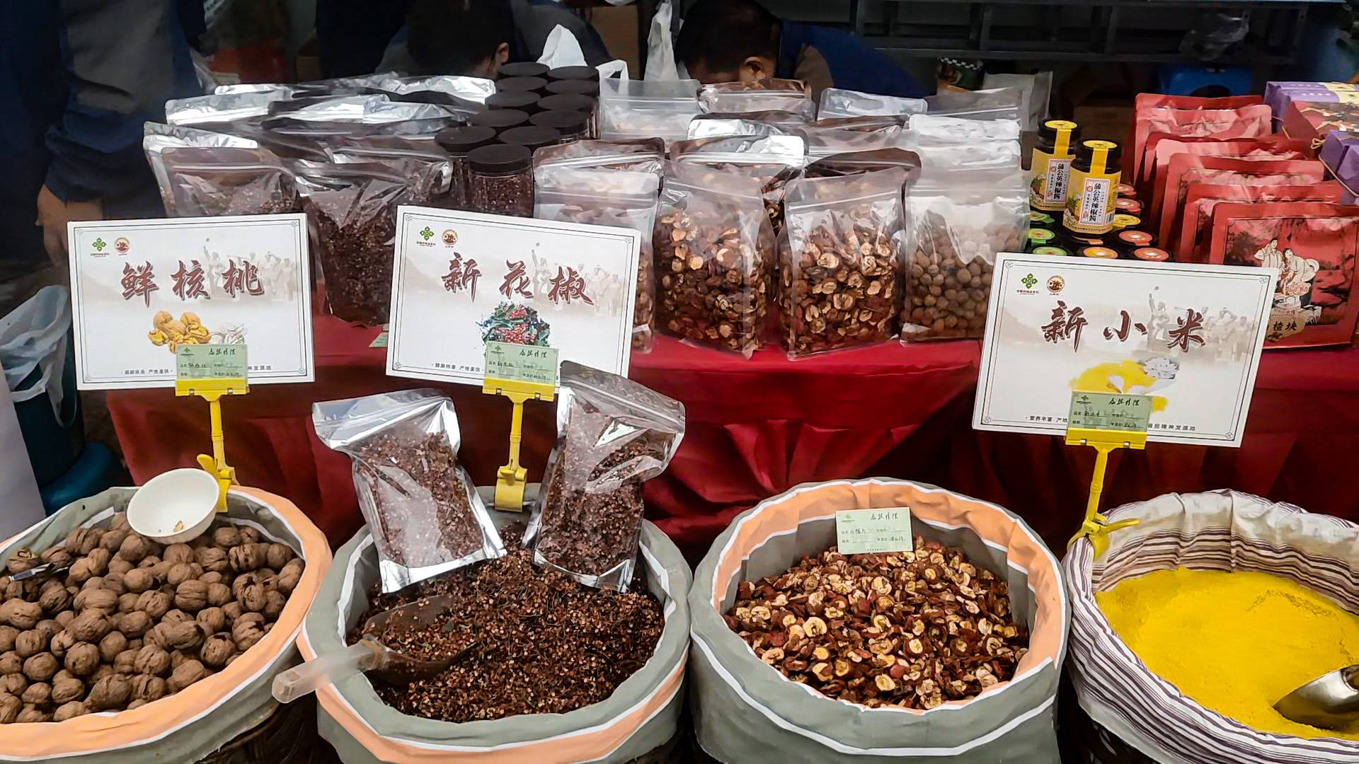 9月19日下午,林州市石板岩供销社的展位整齐摆放着各种山货:带着嫩枝的花椒、刚碾磨好的新小米、应季的山核桃……深吸一口气,仿佛还能嗅到山间草木的新鲜味道。
